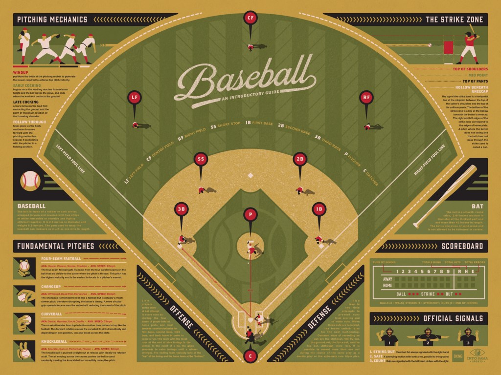 The game is timed by Innings.  An inning is a rotation of both team fielding and batting.  The home team bats in the second half of the inning and the away team bats in the first half of the inning. In the course of an inning a team bats until there are 3 outs. A batter or player is deemed out when a defender gets the ball to another defender prior to an offense player reaching a base or a defender catches the ball after a hit prior to the ball touching the ground. Three outs in an inning ends a team’s chance to score, and three strikes on a batter also results in an out. A strike is called when a batter does not swing at a pitch and it is within the strike zone, while a ball is called when a pitch is outside the strike zone. A strike is also when a player swings at a pitch and misses.  The opposite of this is a ball (not to be confused with the object that’s thrown around).  If a pitch is thrown outside of the agreed upon zone, the batter is rewarded with a free look.  If a batter has 4 of these, they go to first base without having to make a hit.